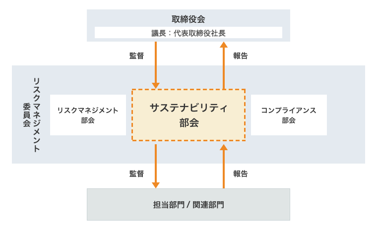当社は経営理念に基づき、8項目から構成される環境行動指針を設定し、事業活動での環境負荷低減に取り組んでいます。このような気候変動を含む環境関連への取り組みは、2023年に設置されたサステナビリティ部会を中心に行っています。サステナビリティ部会はリスクマネジメント委員会に設置された部会の一つであり、全社横断的なサステナブル経営の推進と企業価値の向上を目的としています。具体的な活動として、サステナビリティに関する基本方針や目標、計画の策定、重要課題の決定を行うほか、リスクと機会の評価・管理などを担っています。これらの事項はサステナビリティ部会から取締役会に定期的に報告され、最終的な意思決定が行われます。なお、実務においては取締役会より任命された、当社のESG戦略を統括している取締役兼専務執行役員が主導となり、気候関連問題のリスク/機会に対する評価および管理を担当しています。