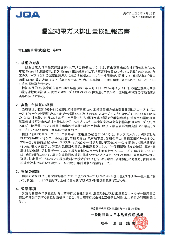 青山商事の算定データおよび算定方法について、ISO14064-3※に準拠した検証を実施いたしました。